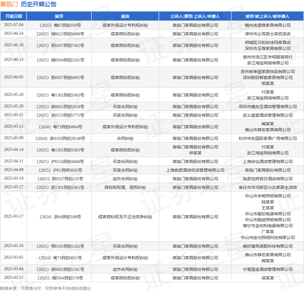 案号:(2025)苏0507民初7402号审理法院:苏州市相城区人民法院案由:侵害商标权纠纷当事人信息: 原告/上诉人:喜临门家具股份有限公司 被告/被上诉人:相城区元和安诗玛家具店、深圳市玉尊家具有限公司开庭日期:2025年6月20日根据统计,近一年内以喜临门家具股份有限公司为当事人的历史开庭公告有50则,其中案由为“买卖合同纠纷”的公告以18则居首,其次为“侵害商标权纠纷”有13则,“侵害外观设计专利权纠纷”有6则。历史开庭公告(前20条)如下: